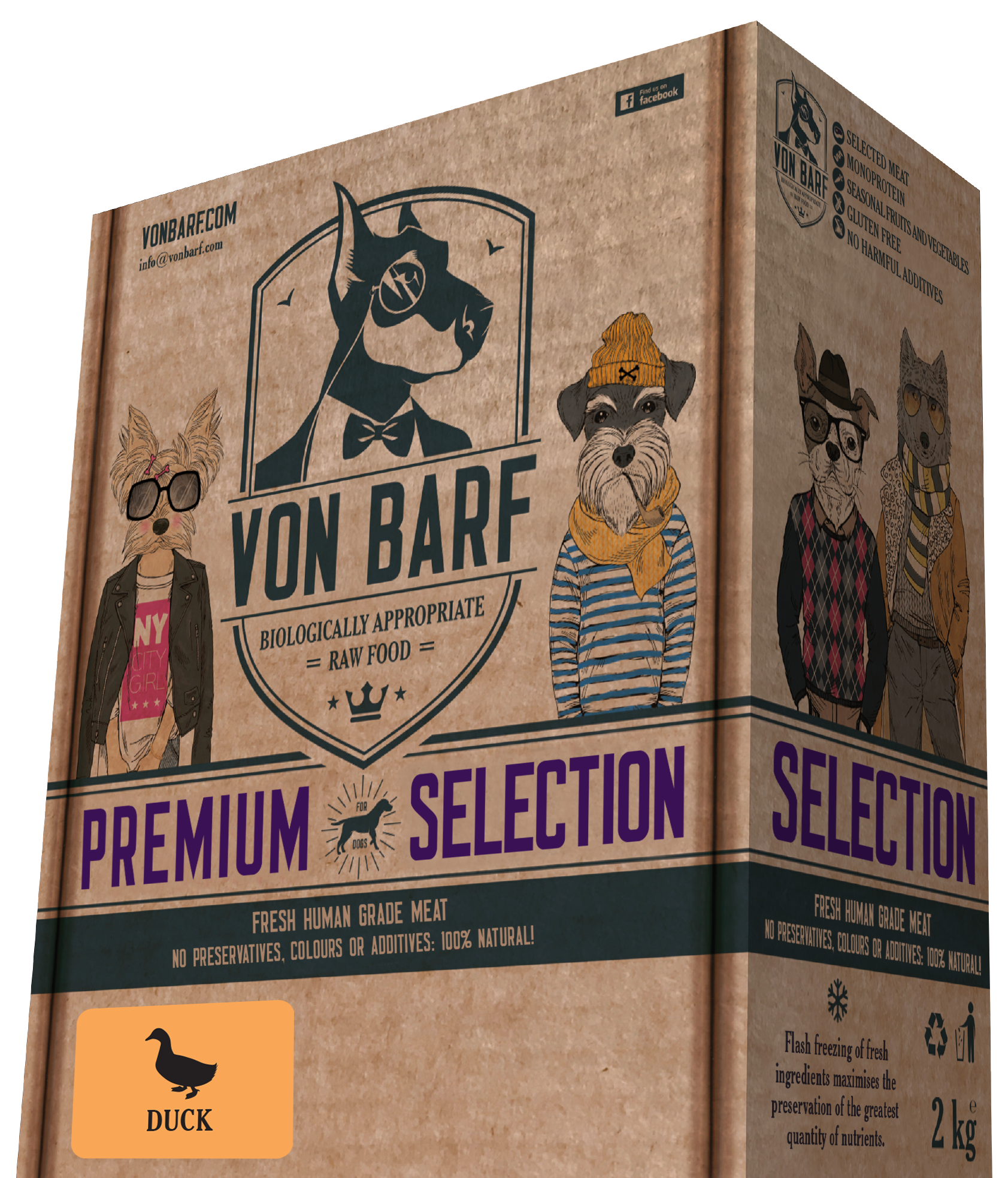 Von BARF Selección Premium de Pato se presenta en un envase de 2 kg (8 salchichas de 250 g).